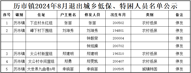 历市镇2024年8月审批通过最低生活保障、支出型困难家庭以及退出低保、特困名单公示