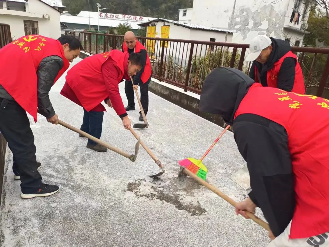 镇村党员干部、志愿者对重点路段、重点区域开展“清雪除冰”行动,给村内各小组桥面上的积雪进行清理保障村民安全通行。