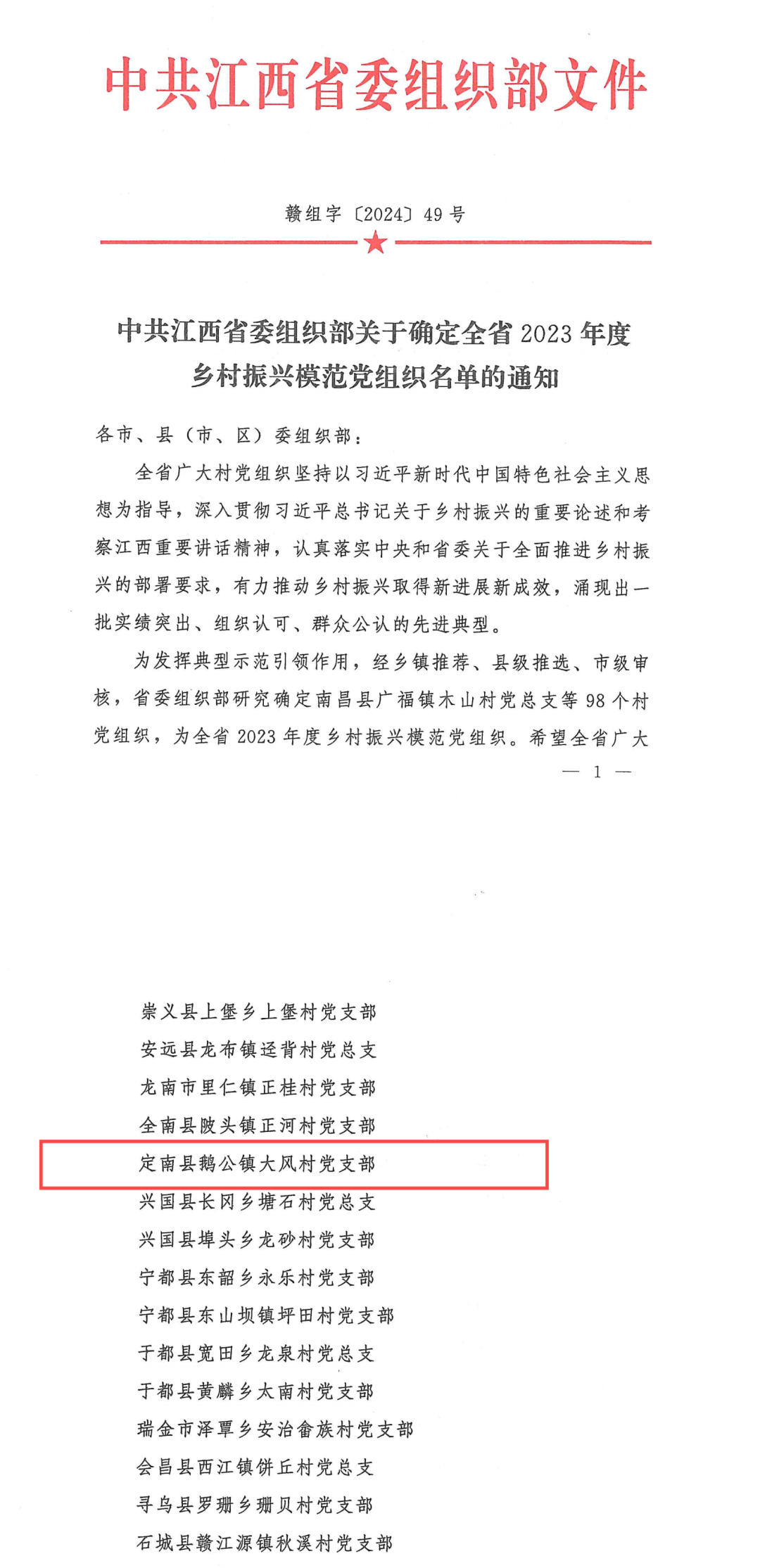 近日,中共江西省委组织部发文,确定98个村党组织为全省2023年度乡村振兴模范党组织。鹅公镇大风村荣获“全省2023年度乡村振兴模范党组织”。