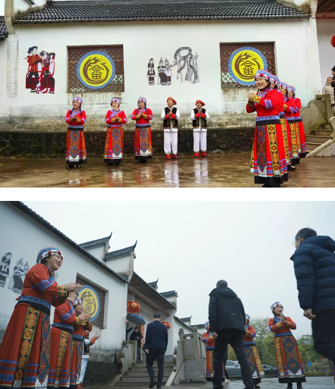 “巴掌一拍,啦啦响,快快进来看一看,富足山村风光好……”畲族新村广场前,九名身着传统畲族服饰的村民唱着山歌,用极具特色的“畲族迎宾礼”,恭迎八方宾朋。