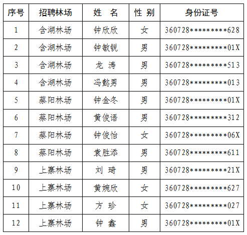 根据《定南县含湖林场2025年工作人员招聘公告》《定南县蔡阳林场2025年工作人员招聘公告》《定南县上寨林场2025年工作人员招聘公告》相关要求,经过报名、资格审查、面试、体检等程序,确定以下12名人员为拟聘用人选,现予以公示。广大干部群众如有情况反映的,请于7个工作日内(2025年10月14日至2025年10月22日)向定南县林业局反映,监督举报电话:0797-4294509。