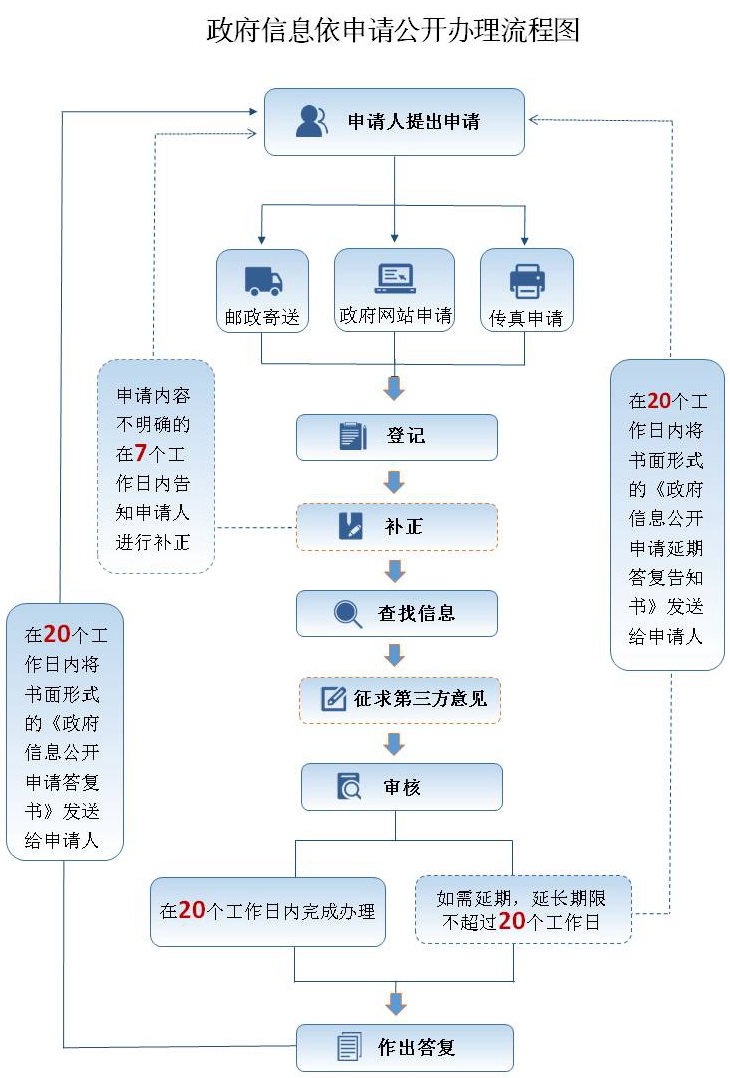 本机关收到政府信息公开申请后,按规定程序对申请进行审查,能够当场答复的,当场予以答复;不能当场答复的,自收到申请之日起在20个工作日内予以答复;如遇特殊情况需延长答复期限的,经本机关信息公开工作机构负责人同意,可延长20个工作日,并告知申请人。