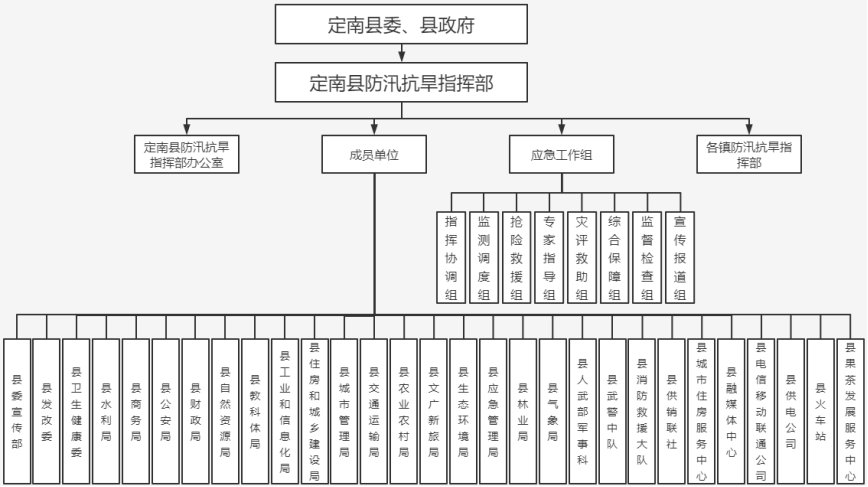 定南县防汛抗旱指挥部(以下简称县防指)是定南县人民政府设立的县政府议事协调机构,由县委、县政府有关部门,县人武部,县武警中队,相关事业单位及抢险救援队伍等组成,全面领导、组织全县的防汛抗旱工作。县防汛抗旱指挥组织机构详见附件2。