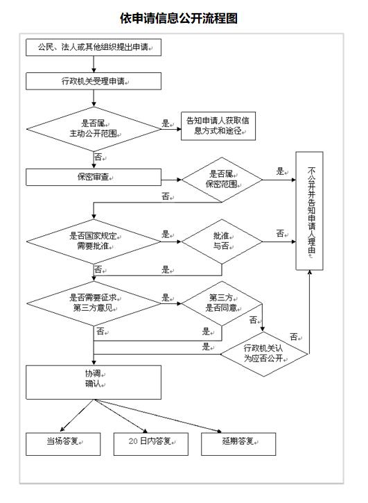 本机关收到政府信息公开申请后,按规定程序对申请进行审查,能够当场答复的,当场予以答复;不能当场答复的,自收到申请之日起在20个工作日内予以答复;如遇特殊情况需延长答复期限的,经本机关信息公开工作机构负责人同意,可延长20个工作日,并告知申请人。